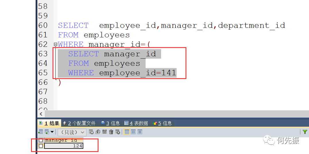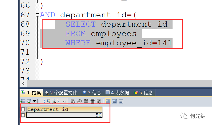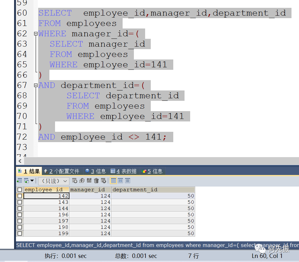 举例四:查询与141号员工的manager_id和department_id相同的其他员工的employee_id,manager_id,department_id