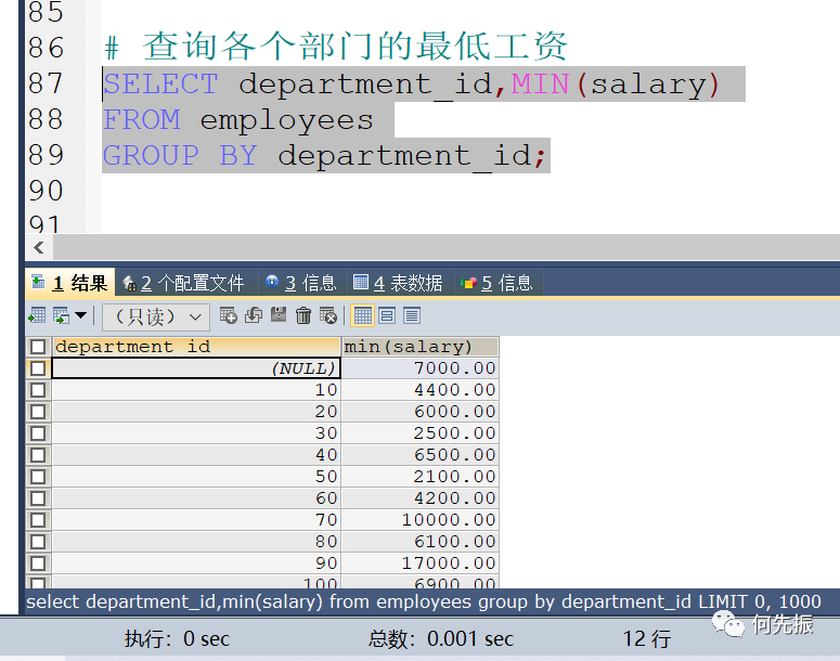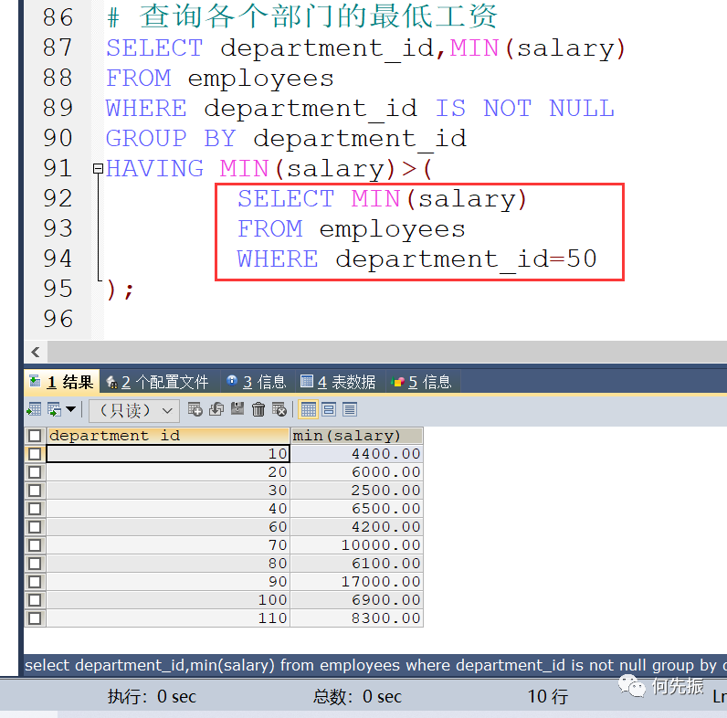 查询最低工资大于50号部门的最低工资的部门id和其他最低工资
