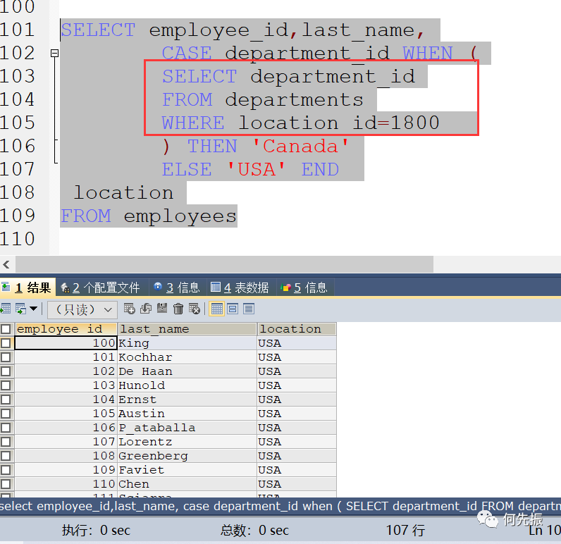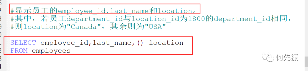 显示员工的employee_id,last_name和location。其中,若员工department_id与location_id为1800的department_id相同,则location为"Canada",其余则为"USA"