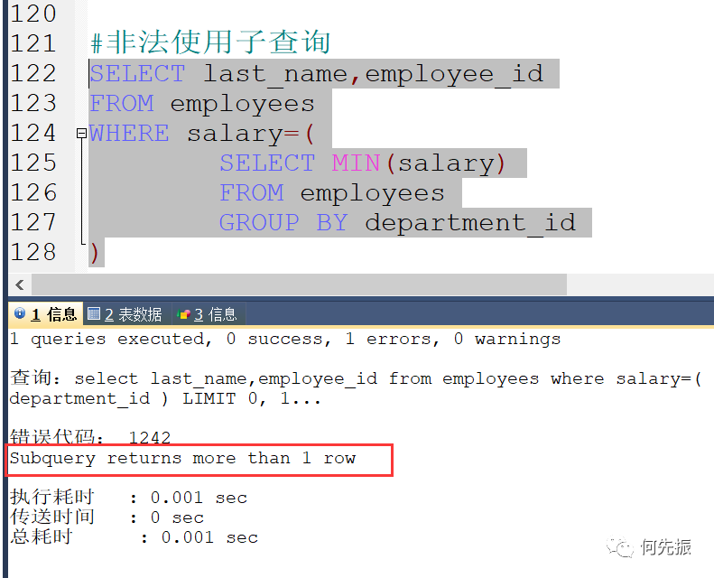 =属于单行操作符,用单行操作符,跟多行子查询就会报错,返回多条结果