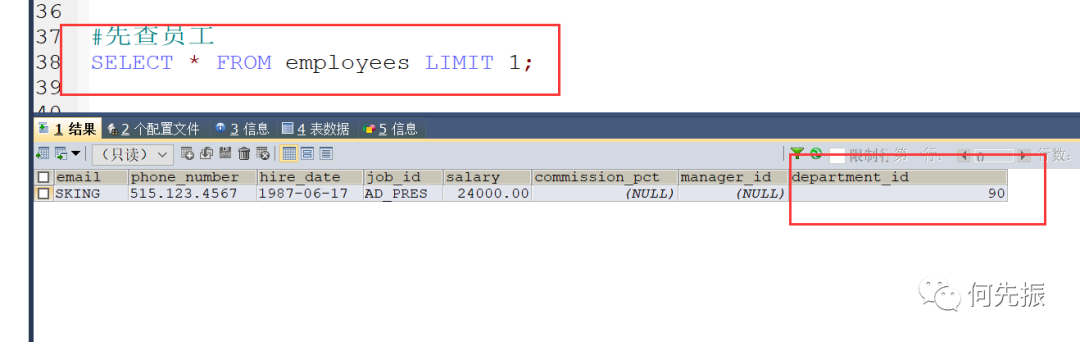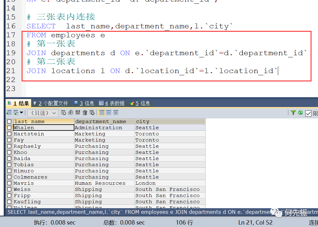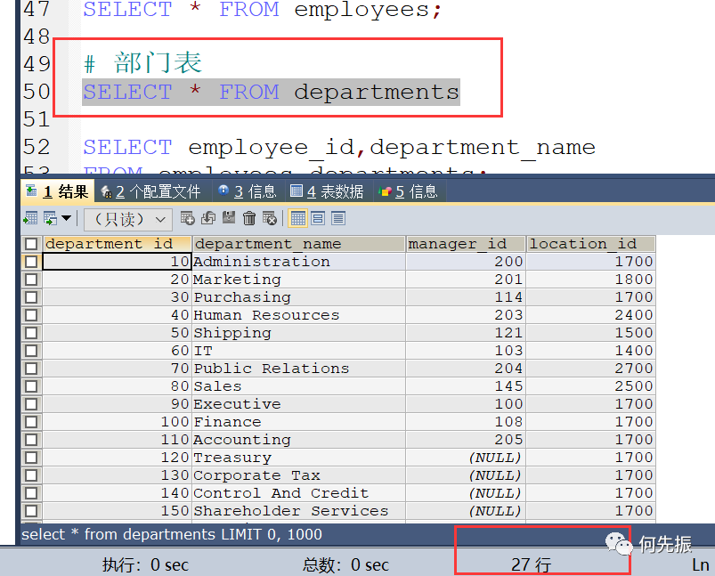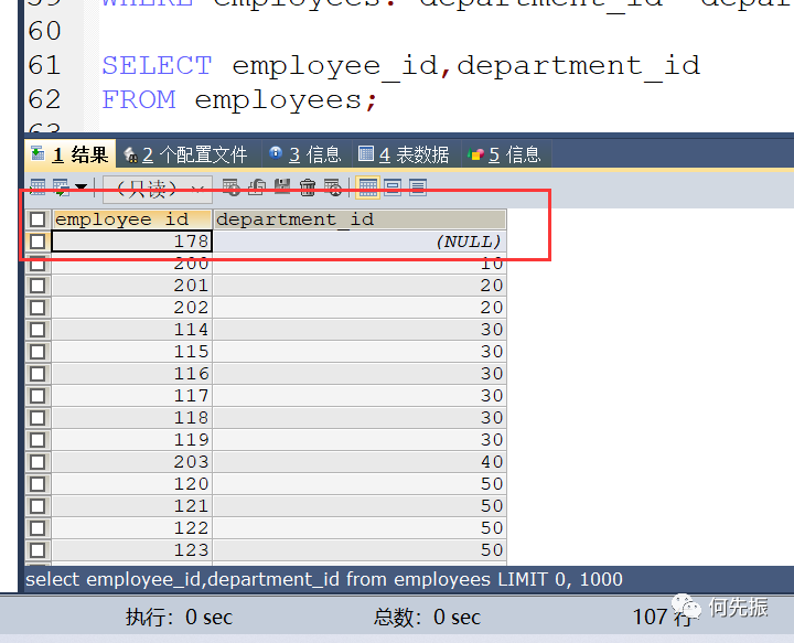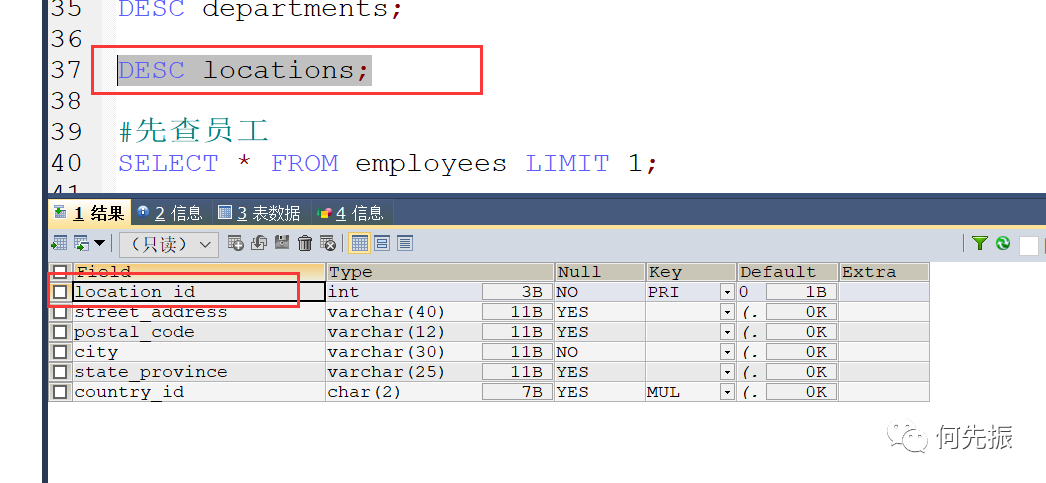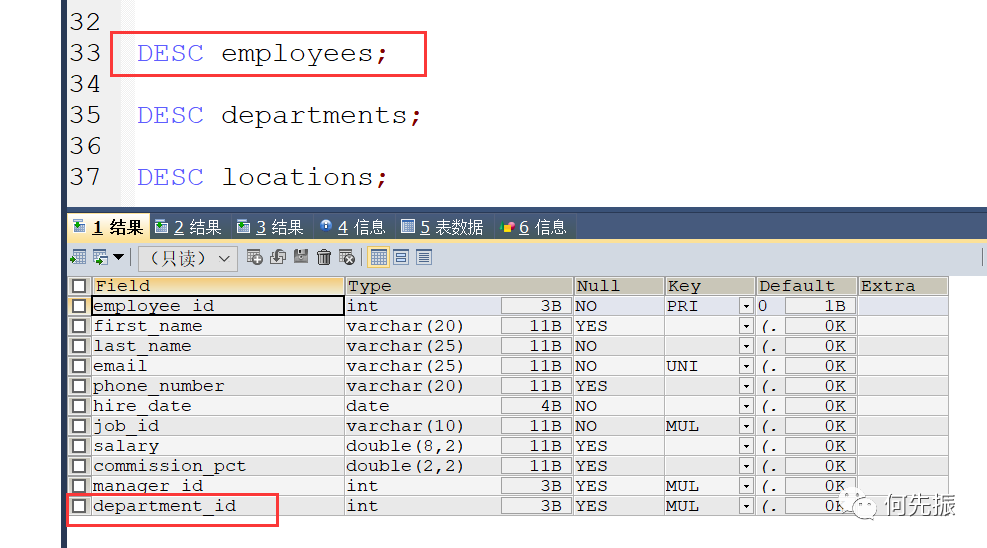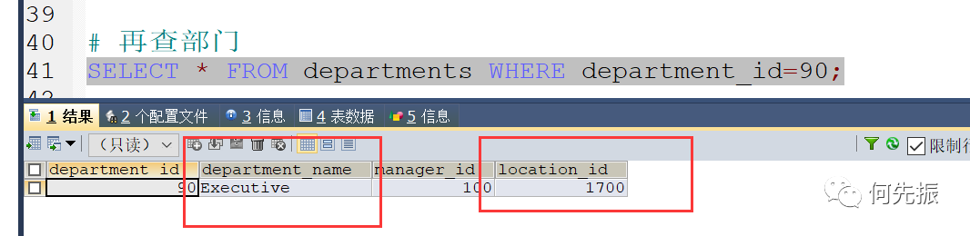 然后通过员工的部门id,查对应的部门才能知道这个部门。如果还想知道这个部门在哪,还需要通过location_id 查对应的locations表。