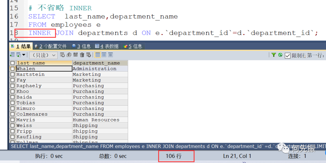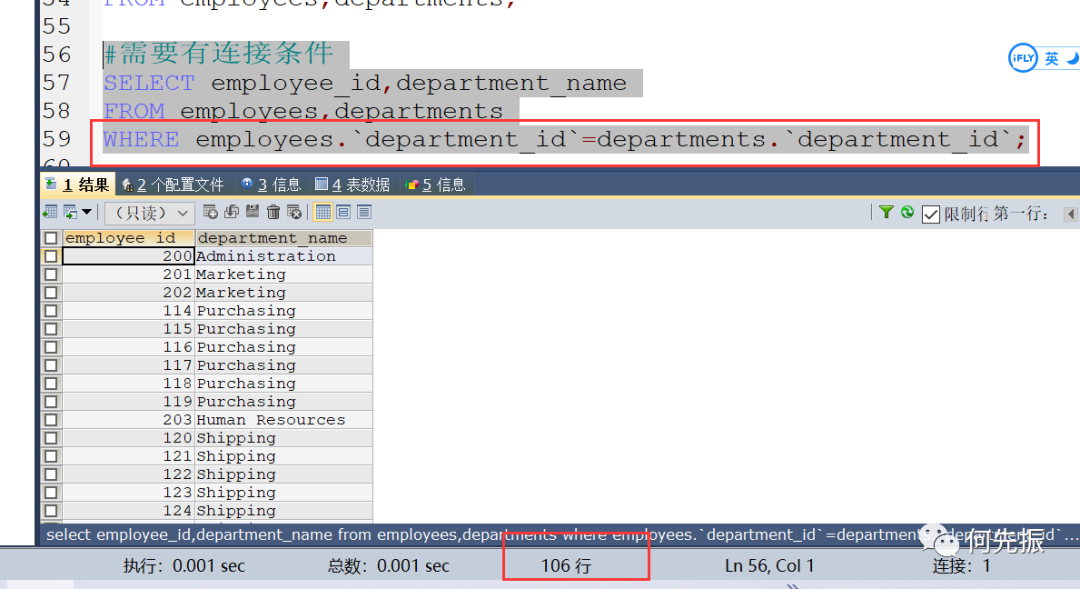 需要有连接条件,通过where条件员工表的部门id关联部门表的部门id,此时查出的是106个员工。