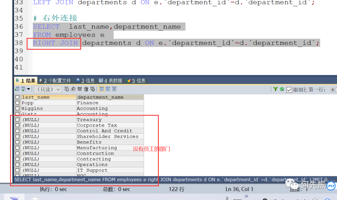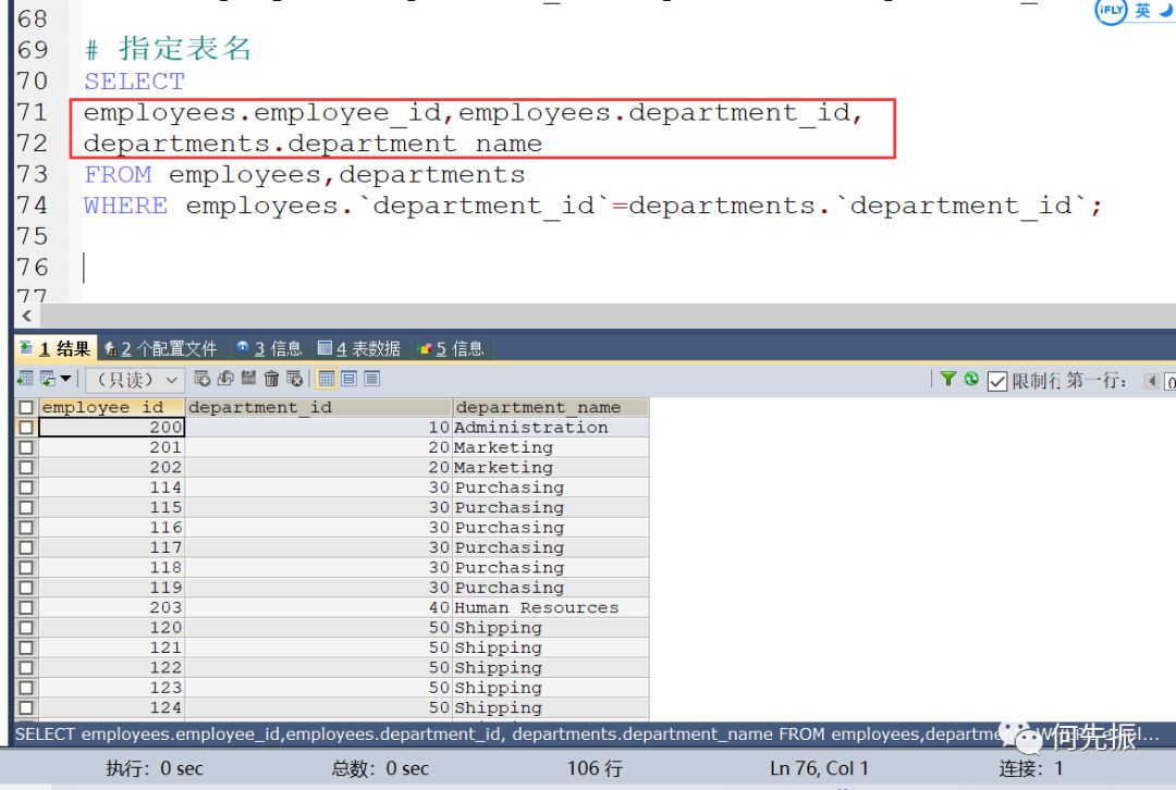 例子:查询所有员工的last_name和deptment_name。