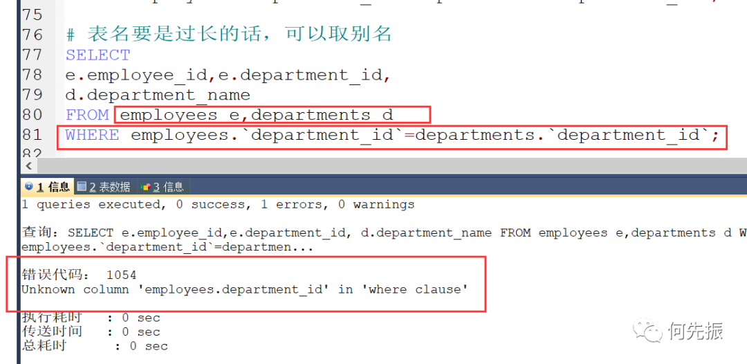 如果给表设置了别名,一旦在SELECT和WHERE中使用表名的话,则必须使用表的别名,而不能再使用表的原名。