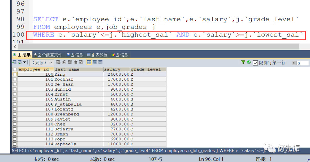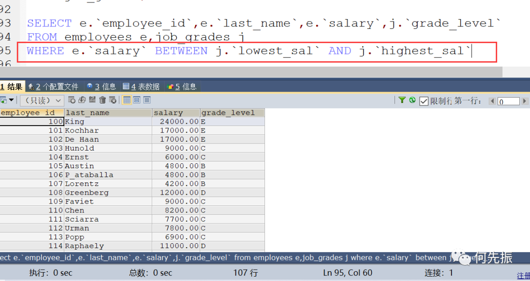 查询每个员工的工资等级 第一种使用>= 或者<=