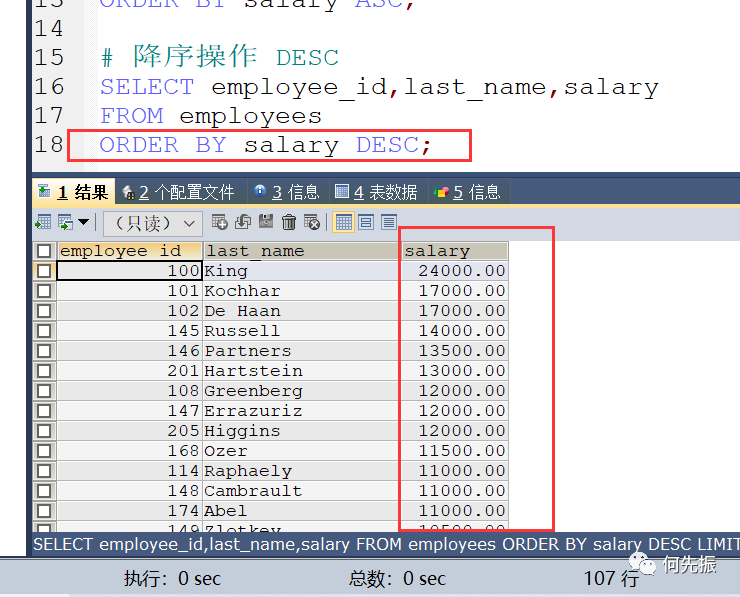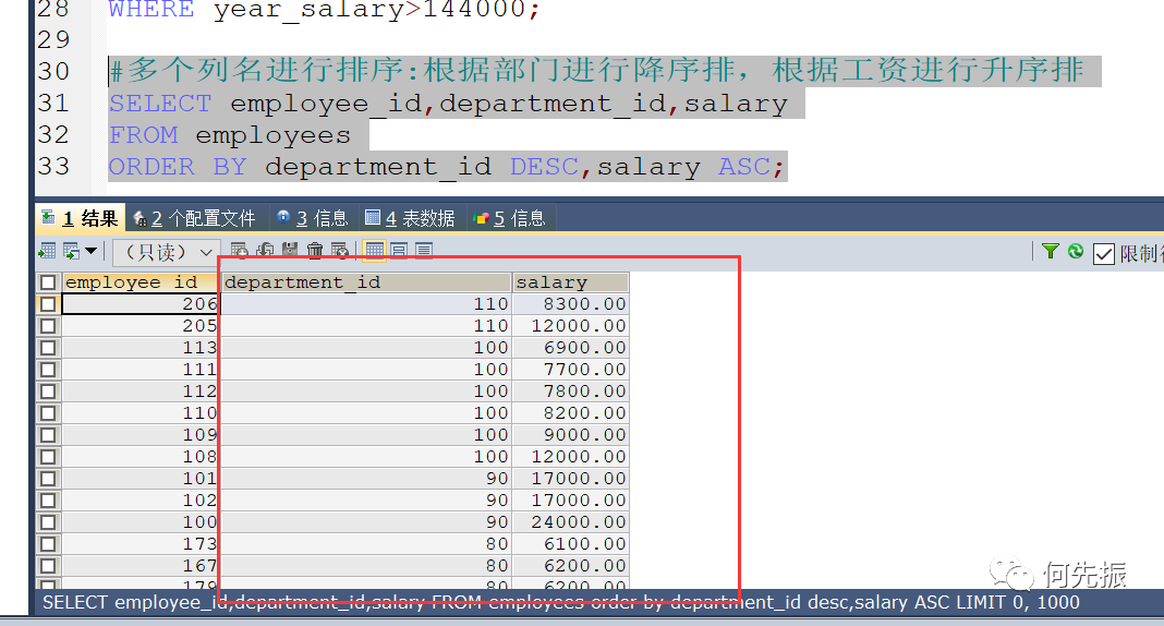 可以指定多个列名,进行排序。例如根据部门id、工资进行排序