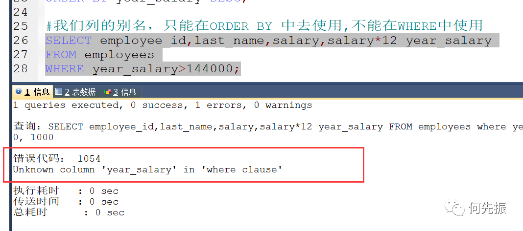 我们列的别名,只能在ORDER BY 中去使用,不能在WHERE中使用。因为在执行的顺序时,先执行FROM再执行WHERE,后面在执行SELECT这个时候才有别名,最后再执行ORDER BY