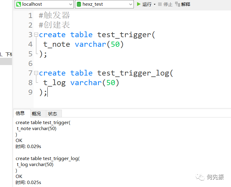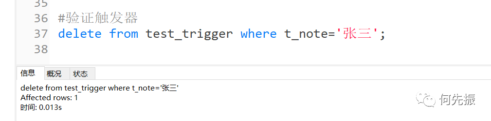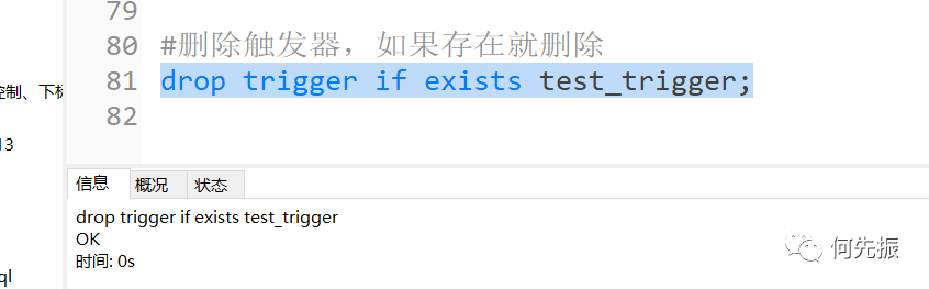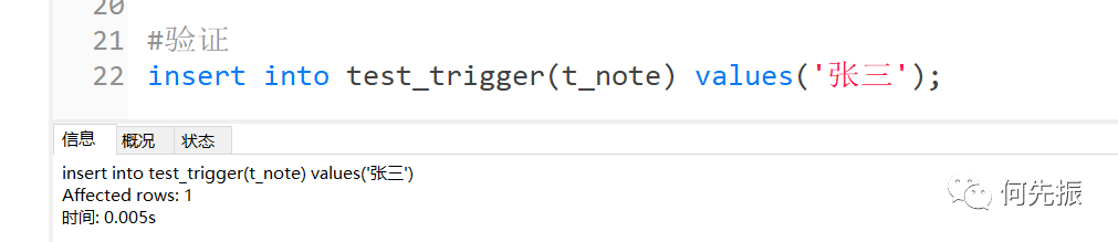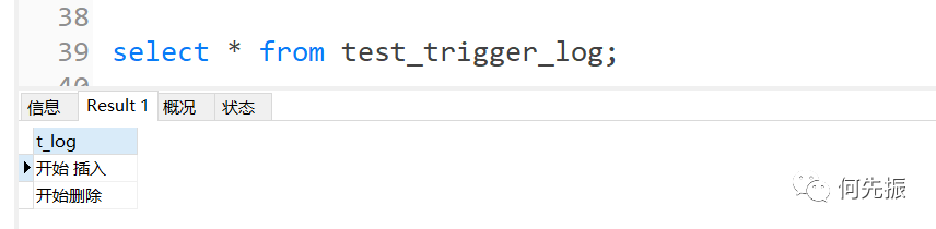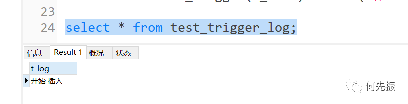#创建触发器,插入test_trigger时往test_trigger_log插入记录delimitercreate trigger before_insert_test_tribefore insert on test_triggerfor each rowbegininsert into test_trigger_log(t_log) values('开始 插入');enddelimiter ;