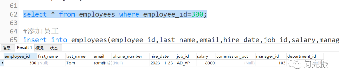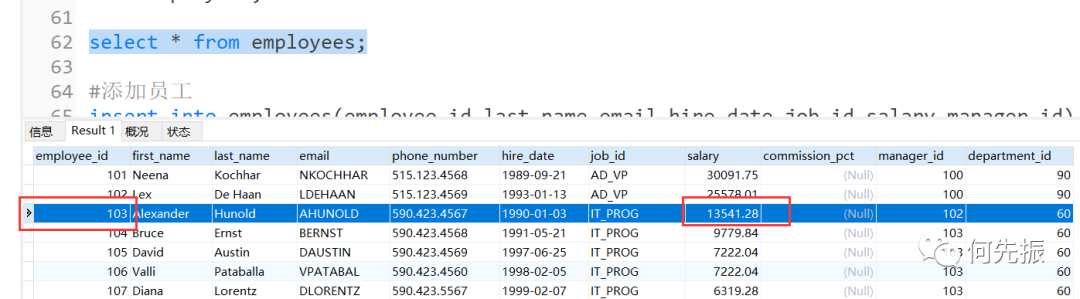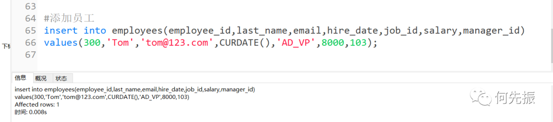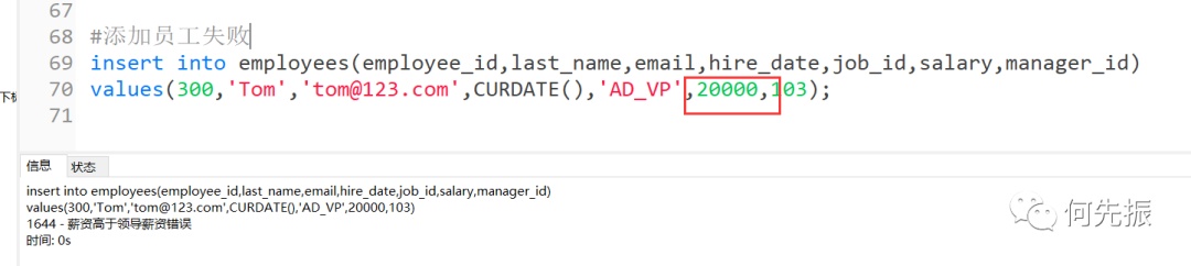 delimiter //create trigger add_emp_tribefore insert on employeesfor each rowbegin#声明变量,领导的工资declare mgr_sal double;#获取领导的工资select salary into mgr_sal from employeeswhere employee_id =NEW.manager_id;#判断if NEW.salary >mgr_salthen signal sqlstate 'HY000'set message_text='薪资高于领导薪资错误';end if;end //delimiter ;