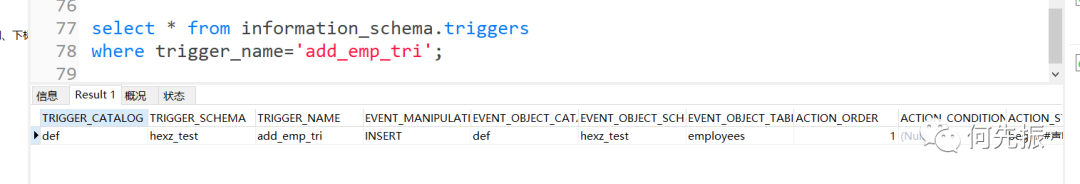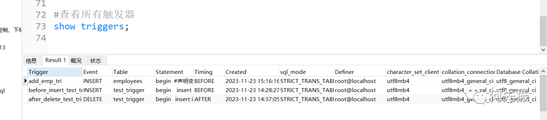 方式3:从系统库information_schema的triggers表中查询某个触发器的信息。