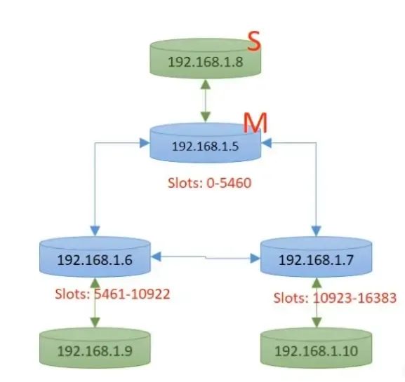 多个 Redis 实例协同进行 采用 slot (槽)分割数据,是 CRC16 与 16384 取模后分散 主从结构和选举算法,保证每个节点的可靠性 客户端可以连接任意一个 node 进行操作