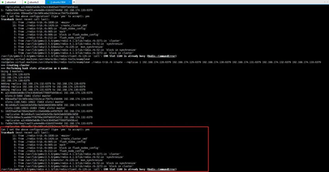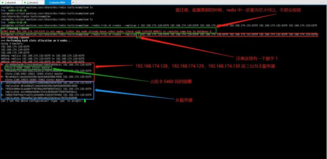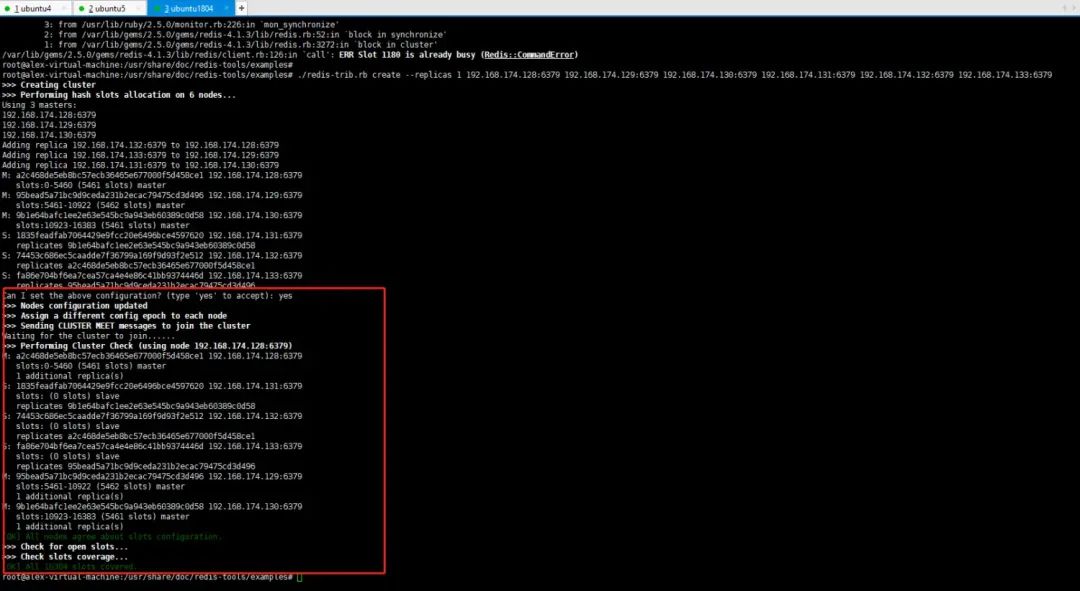 /usr/share/doc/redis-tools/examples/redis-trib.rb create --replicas 1 192.168.174.128:6379 192.168.174.129:6379 192.168.174.130:6379 192.168.174.131:6379 192.168.174.132:6379 192.168.174.133:6379