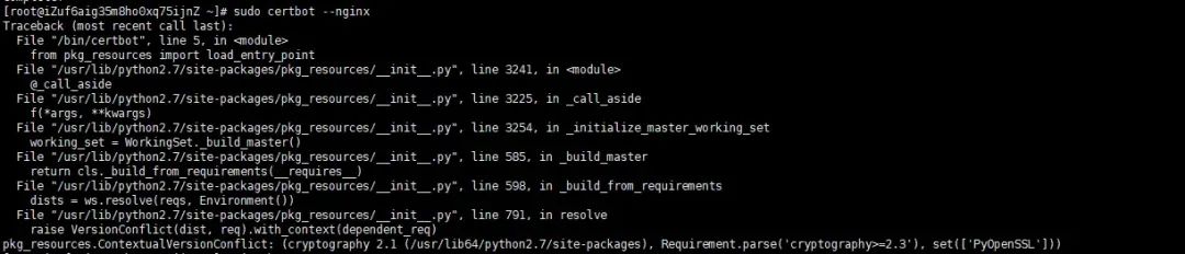 pkg_resources.ContextualVersionConflict: (cryptography 2.1 (/usr/lib64/python2.7/site-packages), Requirement.parse('cryptography>=2.3'), set(['PyOpenSSL']))