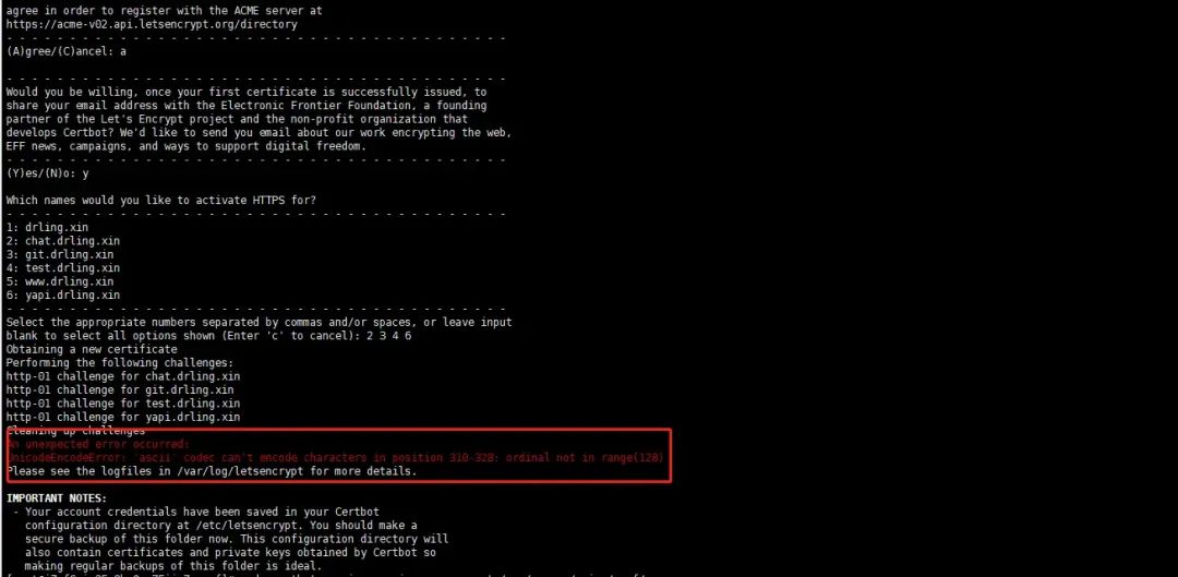 关于 ascii 报错,这篇文章有详细的介绍 通过 Certbot 安装 Let's Encrypt 证书,来实现全站的 HTTPS 访问