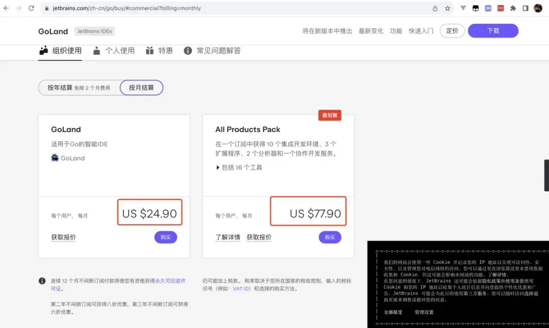 但是,要是直接去购买正版授权的话,价格确实不便宜,光一个 IDE 每月也要 24.9 美元,折合人民币小两百来块了,更别说全家桶了,要 77.9 美元。对于个人用户而言,估计一般都会出门右转去某宝上花个 9.9 买账号了。用确实可以用,但是就是不太稳定。