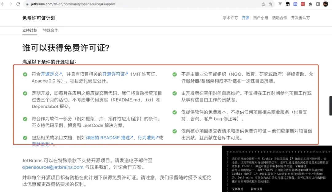 具体满足条件可通过访问 https://www.jetbrains.com/zh-cn/community/opensource/#support 地址进行查看。