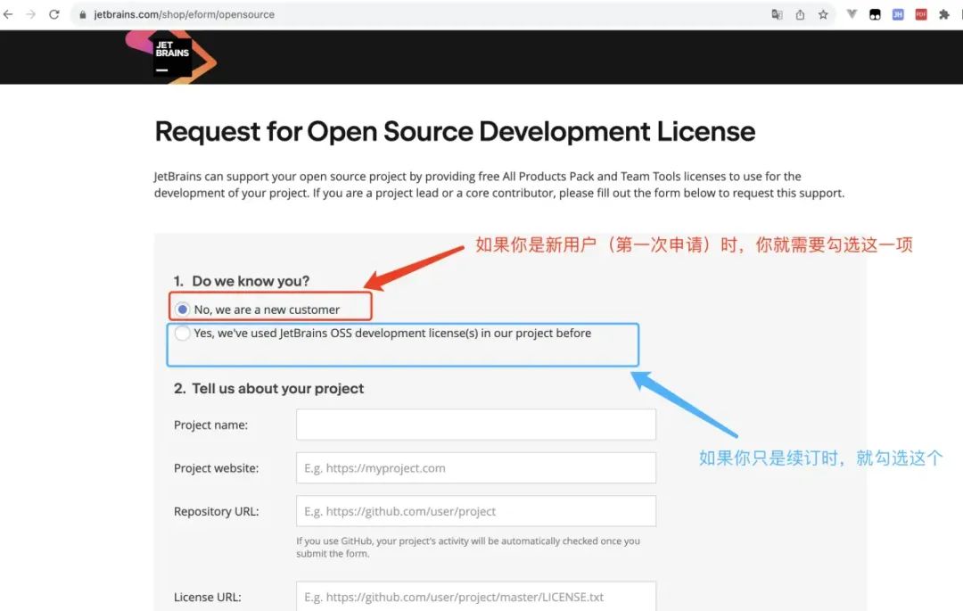 No:之前从来没有申请过的,就选这个。Yes:之前弄过开源许可的,就直接选这个,然后填上自己的 License ID 即可。