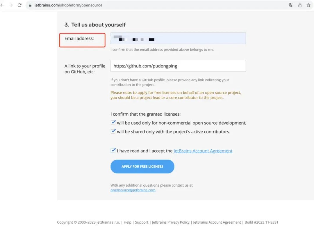 Email address: 比较重要的是这一项,这个邮箱要和你 GitHub 主页上的邮箱地址一致。 A link to your profile on GitHub,etc: 这个填你 GitHub 的主页地址即可。