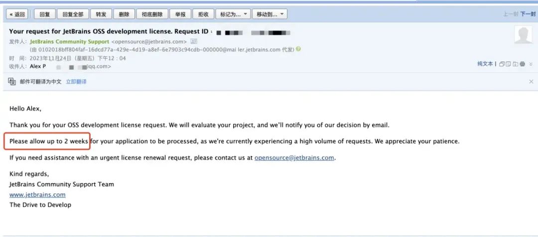 申请之后,你要留心你的邮箱里面标题为 License Certificate for JetBrains 开头的邮件。然后你需要点击 Take me to my license(s) 这个许可证可以直接和你的 JetBrains 账号直接绑定,使用 IDE 的时候直接通过你的账号登录即可。你也可以直接下载离线激活码,通过激活码的形式去激活 IDE。这个就看自己的喜好了。