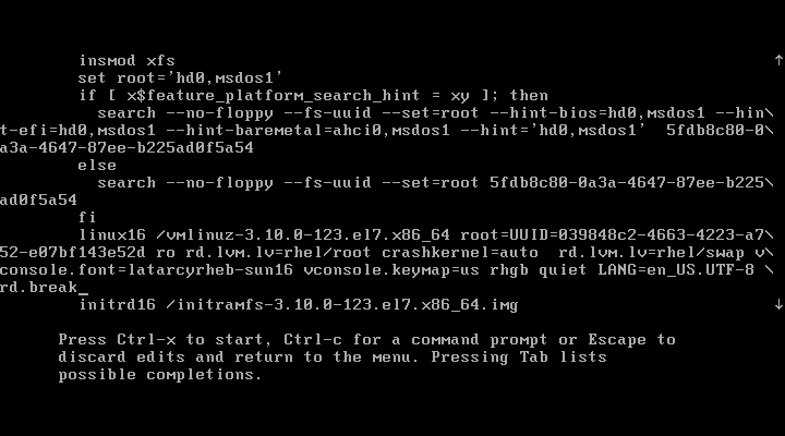 页面内容一般情况下是显示不全的,需要按住上下箭头滚动。 添加 \rd.break 参数的时候,你也可以不用添加 '\反斜杠' 但是必须要先在 linux16 末尾处敲击一个空格之后写入 rd.break 参数