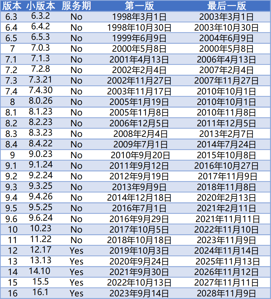 PostgreSQL全球开发组每年大约会发布一个包含新功能的新主要版本。每个主要版本会收到至少每三个月发布一次的错误修复。以下是PG所有版本发布历史汇总图: