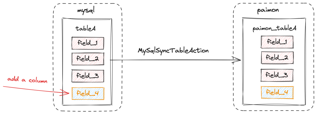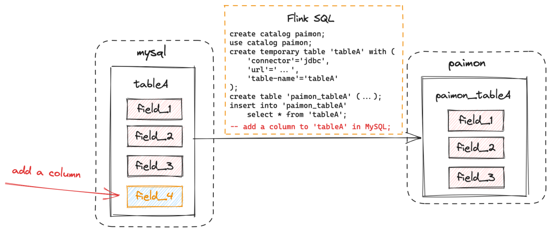 上图是使用 Flink SQL 来完成入湖,简单,但是当源表添加新列后,同步作业不会同步新的列,下游 Paimon 表也不会增加新列。