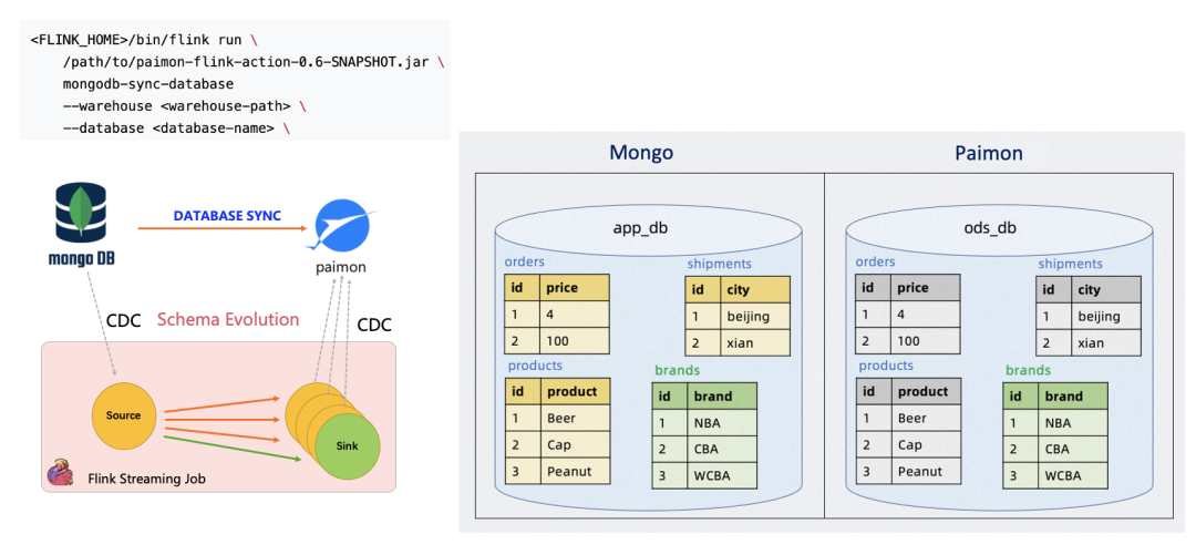 你可以跟随 Demo 步骤体验 Paimon CDC 的全自动同步之旅,Demo 展示同步 Mongo DB 的数据到Paimon 中,如下图。