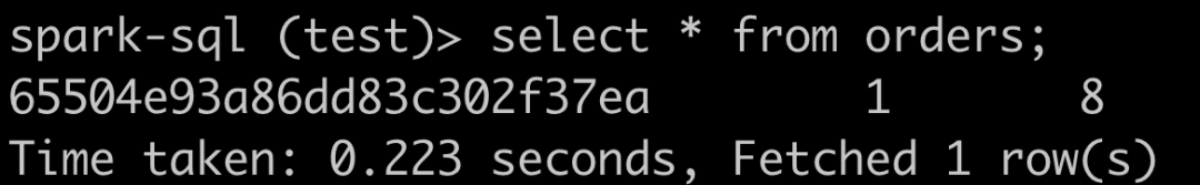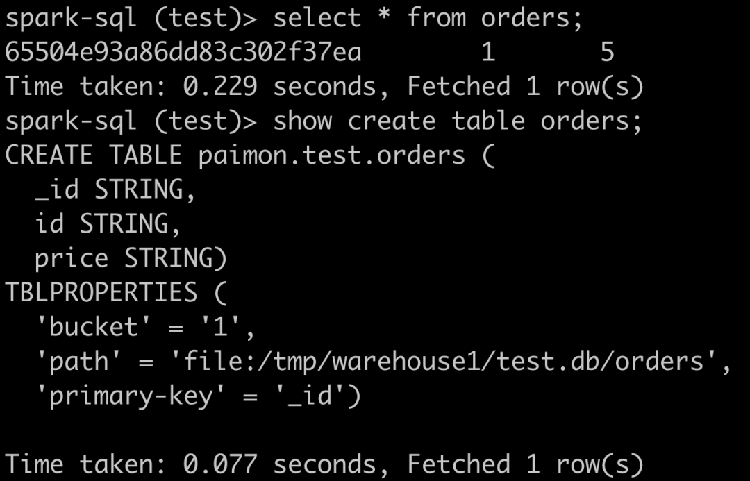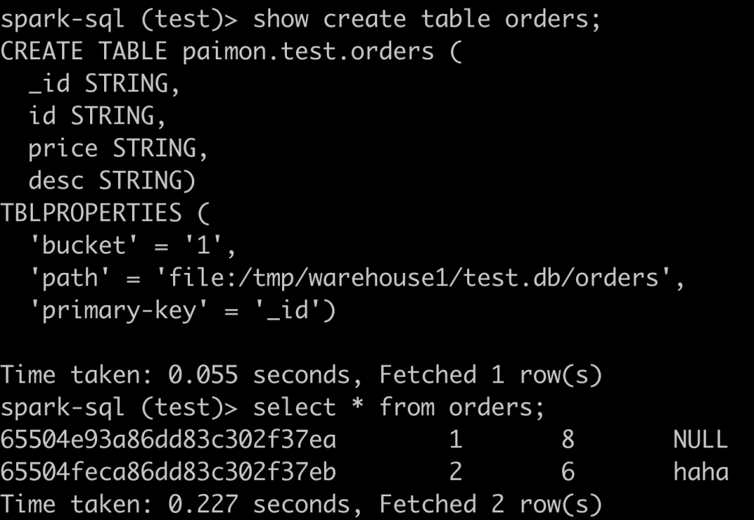 可以看到这条数据被同步到 Paimon 里,并且可以看到 orders 表的 Schema 里多了一列 “_id”,这列是MongoDB 自动生成的隐含的主键。