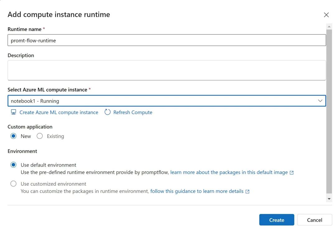 “运行时”充当运行应用程序所需的计算资源,例如包含所有必要的依赖项包的 Docker 映像。这是“Prompt Flow”执行的必备条件。因此,建议在开始“Prompt Flow”创建之前设置运行时。