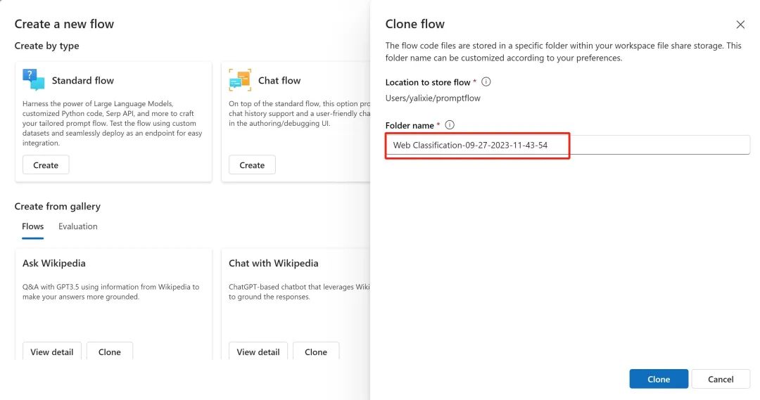 为了方便演示,我们克隆一个现有的“Prompt Flow”中,选择“Web Classification”,如下图: