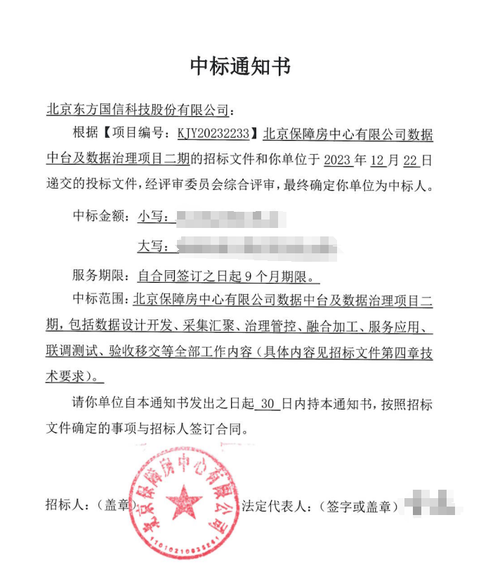 2023年12月26日,在近日结束的北京保障房中心数据中台及数据治理项目二期招标中,东方国信凭借卓越的技术实力和丰富的项目经验,以综合评分第一名的成绩成功中标。