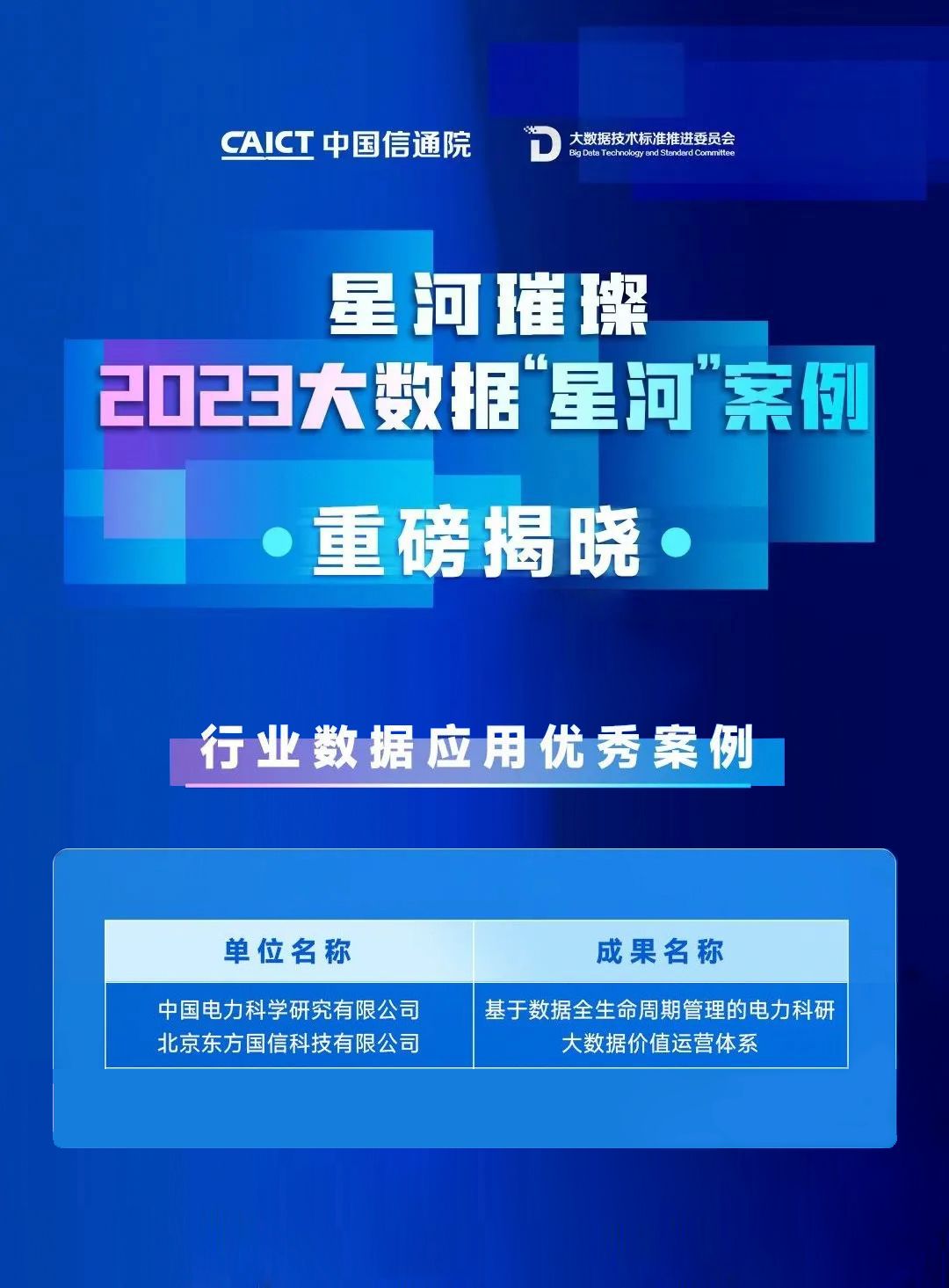 “星河(Galaxy)”案例征集包括行业数据应用、数据安全、数据要素流通、数据资产管理、数据库、以及数据向善六大方向。案例征集自9月启动以来,受到了业界广泛关注和踊跃报名。本次评选从技术创新、应用创新、成果效益、成果创新点、成果合规性等方面对申报案例进行考察,东方国信与中国电科院共同打造的“基于数据全生命周期管理的电力科研大数据价值运营体系”成果通过层层筛选,入选行业数据应用优秀案例,为电力行业数字化发展注入强劲动能。