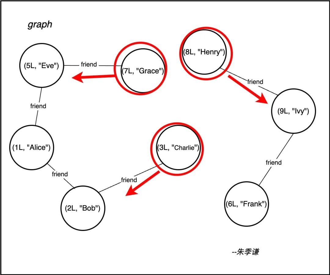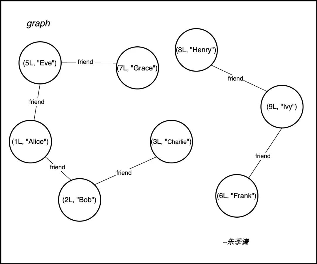 右边同样是一个连通图,该子图里每个顶点都存在路径相连,包括顶点:{(8L, "Henry"),(9L, "Ivy"),(6L, "Frank")}。