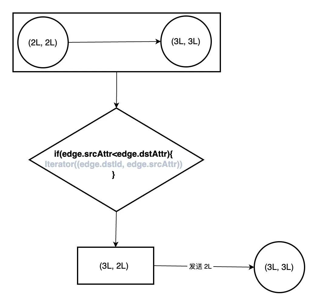 这个方法的作用,就是找出同一条边上哪个顶点最小,例如下图中,2L 比 3L 小,那么 2L 是这条边上最小的顶点,将以最大点关联最小点的方式 (edge.dstId, edge.srcAttr) 即 (3L, 2L) 保存下来。最后会将 (3L, 2L) 中的 _.2 也就是 2L 发送给顶点 (3L, 3L),而顶点 (3L, 3L) 后续需要做的事情是,是将这一轮收到的消息即最小顶点 2L 与现在的属性 3L 值通过 math.min(a, b) 做比较,保留最小顶点当作属性值,即变成了 (3L, 2L)。