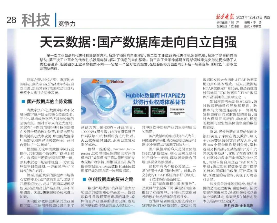 2023年度科技行业“竞争力”评选 ,多层次展现科技互联行业在 2023 年内所取得的一系列精彩突破和超越,通过聚焦科技互联行业在人工智能、电商、新零售、在线教育、企业社会责任等方面的动作,分享科技互联行业企业、平台、品牌在实现各种“遥遥领先”过程中的故事和经验。北京晚报《科技》评:天云数据,国产数据库走向自立自强。