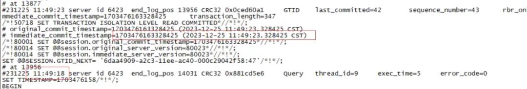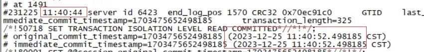 对于非自动提交的事务,则 GTID event 的 immediate_commit_timestamp 为事务提交的时间,但是语句开始执行的时间需要查看具体语句的 event 才可以,不能查看 GTID event header 的 timestamp,这是 commit 命令发起的时间,如下图: