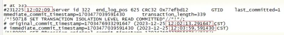 主库发起语句时间:12:02:09 主库提交事务时间:12:02:13 从库提交事务时间:12:03:59