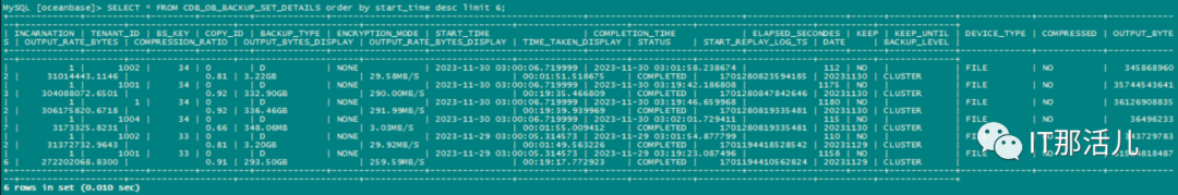 SELECT * FROM CDB_OB_BACKUP_SET_DETAILS order by start_time desc limit 6;
