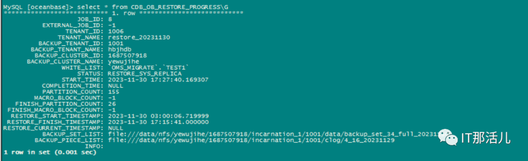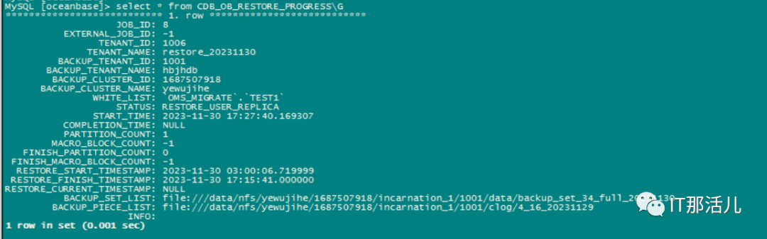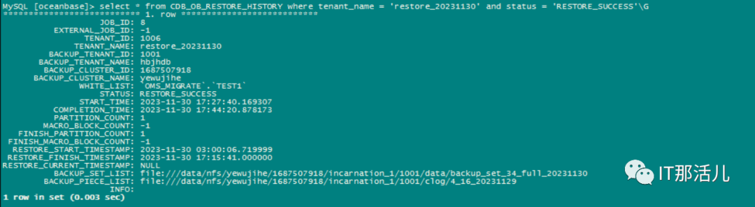 select * from CDB_OB_RESTORE_HISTORY where tenant_name = 'restore_20231130' and status = 'RESTORE_SUCCESS'\G