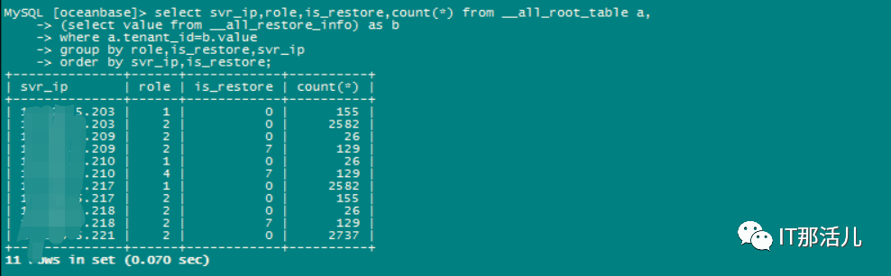 select svr_ip,role,is_restore,count(*) from __all_root_table a,