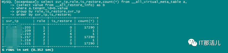 select svr_ip,role,is_restore,count(*) from __all_virtual_meta_table a,