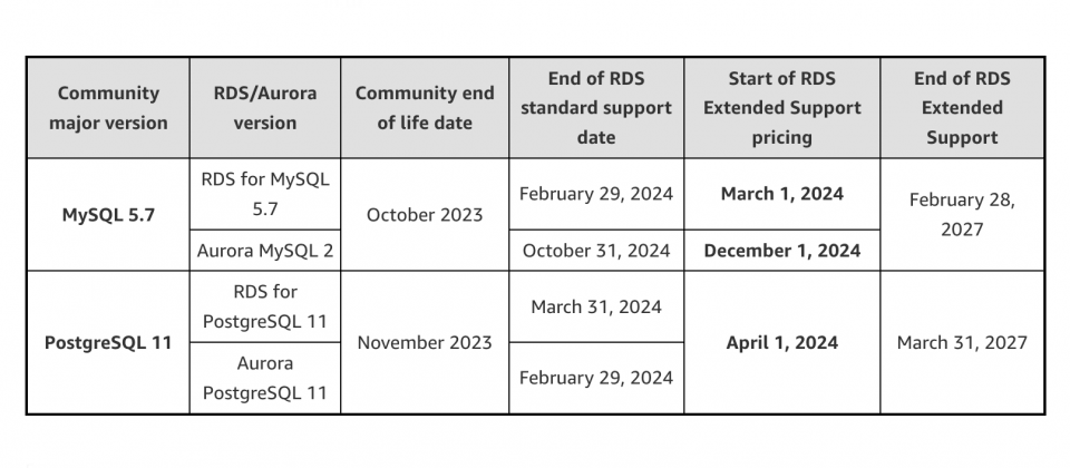 AWS 宣布从2024年2月29日开始,Amazon Aurora 和Amazon RDS上的MySQL 5.7和PostgreSQL 11数据库,将自动注册加入Amazon RDS延伸支持。 官方提到,这能够避免数据库在自动升级至主要版本时,发生意外停机和兼容性问题,让用户能够更好地控制数据库升级的时机。
