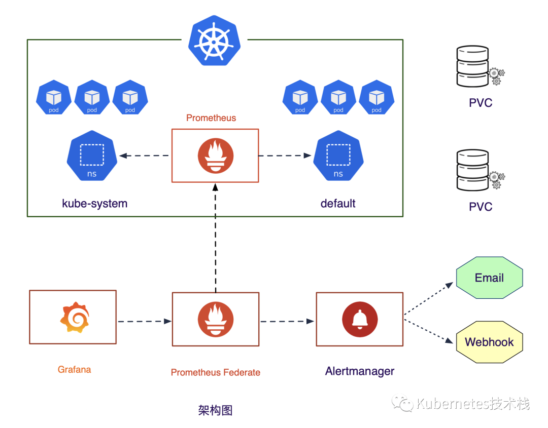 当我们有多个Kubernetes集群的时候,这个时候就需要需要指标汇总的需求了,如上图一样,我们假定在外部部署一个Prometheus的Federate,然后去采集当前k8s中的kube-system与default俩个 namespace。
