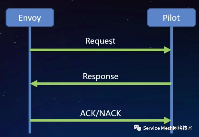 Envoy 发起请求到Pilot (xds server),Pilot (xds server)根据请求返回一个Response的响应,Envoy收到响应,动态加载响应里面的配置,根据加载的配置进行ACK/NACK (类型与TCP的三次握手)这个时候只是生产一些me