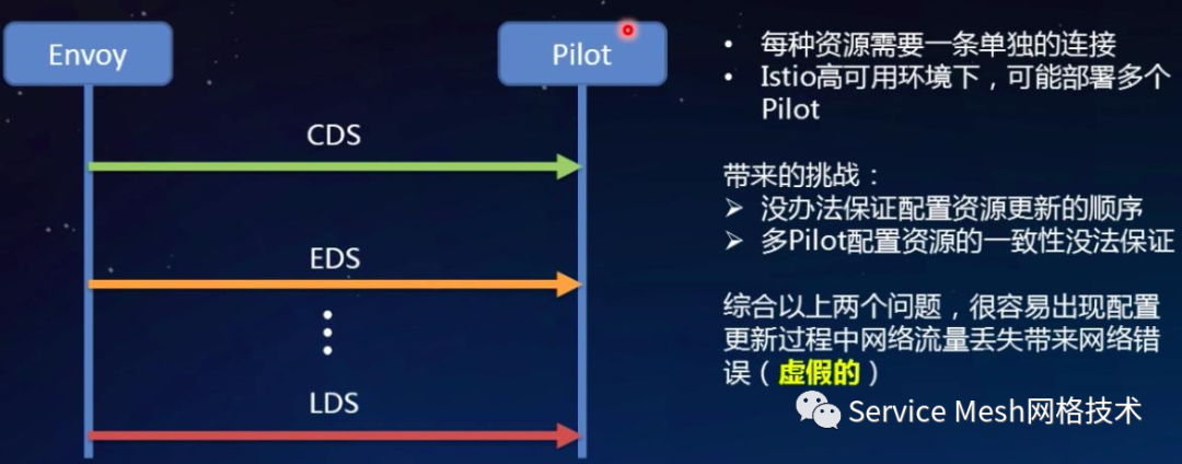 在生产中需要部署多个Pilot来保证高可用,多个连接可以能会连接到多个Pilot,这样就没有办法保证配置资源的更新,比如LDS连接到Pilot1 ,CDS连接到Pilot2,EDS连接到Pilot3,那么不同资源的动态获取资源的顺序无法保证的。有办法保证也需要耗费很大的代价。