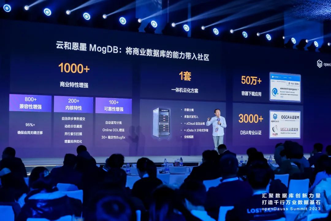 随后盖国强指出,作为基于 openGauss 打造的集中式关系型数据库 MogDB,已经陪伴 openGauss 走过了三个年头,在1000多个日夜中,练就了1001个优秀品质:在商业特性增强上,MogDB 达成了超过1000个特性增强,其中包括兼容性改进、内核特性增强、可靠性增强,确保用户可以无缝迁移,安全稳定地使用 MogDB 数据库;在应用实践上,MogDB 提供了一套一体机云化方案,通过存算分离、多节点并发写入,并且结合云和恩墨的优势产品 zData X 和 zCloud,为用户提供了一体化的极致性能、极致易用性的应用体验。除此之外,云和恩墨还拥有一批国内知名的数据库技术专家,在过去十余年间服务了上千家企业客户的数以万计的数据库环境,拥有完整的最佳实践和系统方法论,能够确保用户事前“安心”、事中“放心”、事后“舒心”。演讲的最后盖国强表示:“让技术无远弗届,让创新无所不达,MogDB 数据库 + openGauss,能够给用户一个更优选择!”