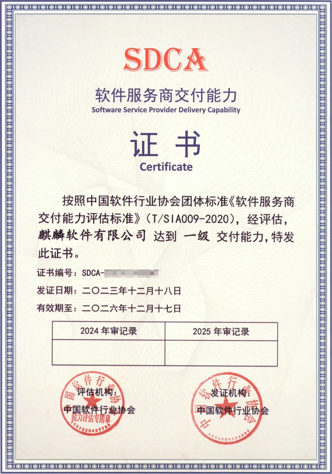 SDCA软件服务商交付能力是中国软件行业协会根据《软件服务商交付能力评估标准》(T/SIA009-2020),采用SDCA交付能力模型对软件服务商交付能力进行的评估。SDCA交付能力模型由基本能力、技术能力、人员能力、管理能力、财务状况、信用与履约能力6个维度集合描述,评估级别从高到低分为一级、二级、三级和四级。该认证旨在为政府机关、企事业单位、社会团体等组织或机构考察软件服务商能力,甄选出技术能力较强、交付风险较低的软件服务商。本次获评SDCA软件服务商交付能力一级资质,是对麒麟软件完善的服务体系、统一的服务标准、高效的服务管理、高超的技术水平、优秀的服务团队的充分肯定。