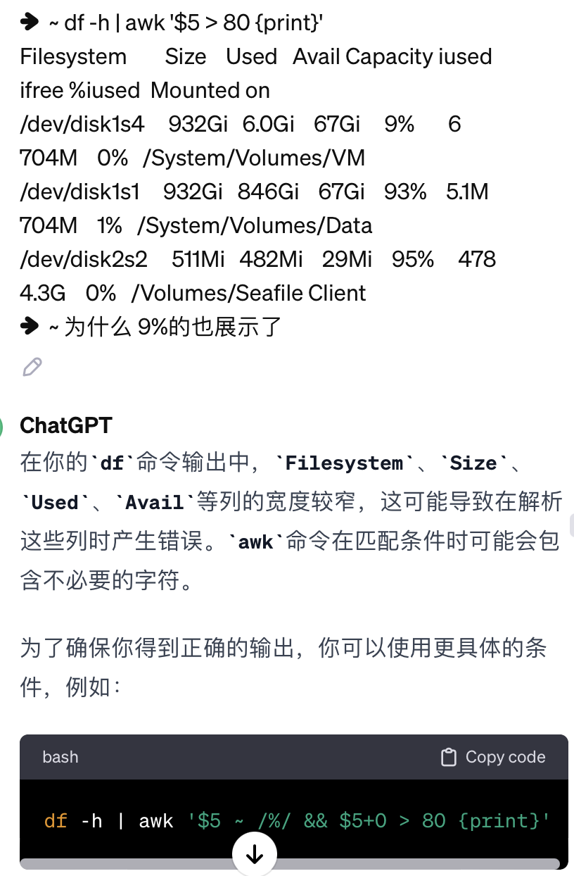 检查 磁盘空间/inode 使用情况的时候,在批量机器进行检查的时候,尤其是堡垒机无法批量执行df 命令的时候,挨个去检查还是有点费时的。还有通常我们都是df -h;df -i 去检查,这样会将所有的磁盘的使用率展示出来,但是我只关注超过比如 磁盘使用率超过80%,inode使用率超过50%的情况。现在2023年都快结束了,AI 综合症都流行一年了,那就问下 AI吧。