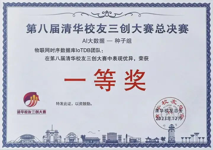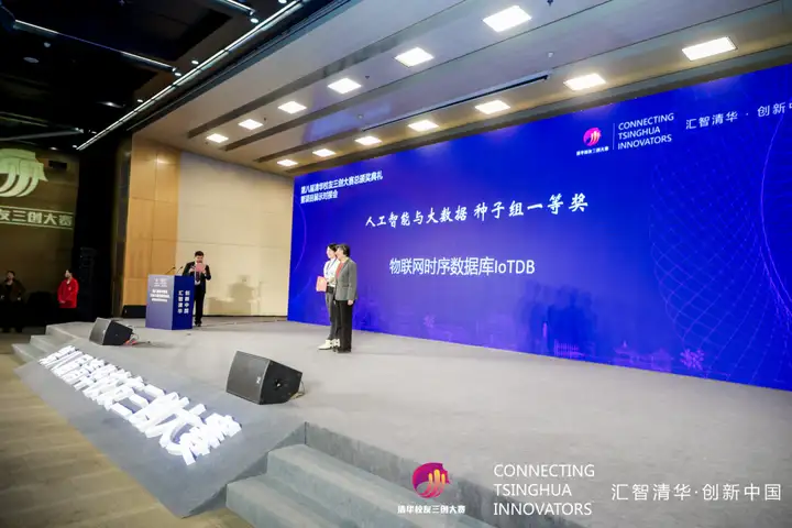 2023 年 12 月 28 日,第八届清华校友三创大赛总颁奖典礼暨项目展示对接会在清华大学举办。活动汇聚 100 多个优质的三创项目,并特邀三创平台"政产学研金服用”各界代表与生态伙伴,以搭建高层次人才、优质创新创业项目与地方政府、产业资源对接的桥梁,更高质量地服务经济社会发展。其中,物联网时序数据库 IoTDB被授予人工智能与大数据种子组一等奖,并现场进行了涉及产品技术、应用、生态等方向的路演展示。