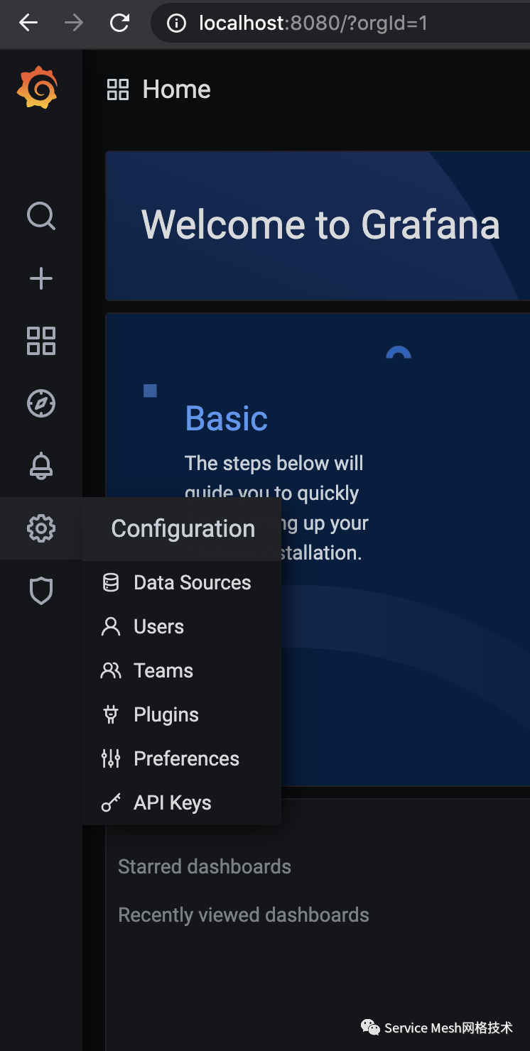登录完成后,我们就可以添加 Loki 作为数据源了,从左侧面板,选择配置 -> 数据源:
